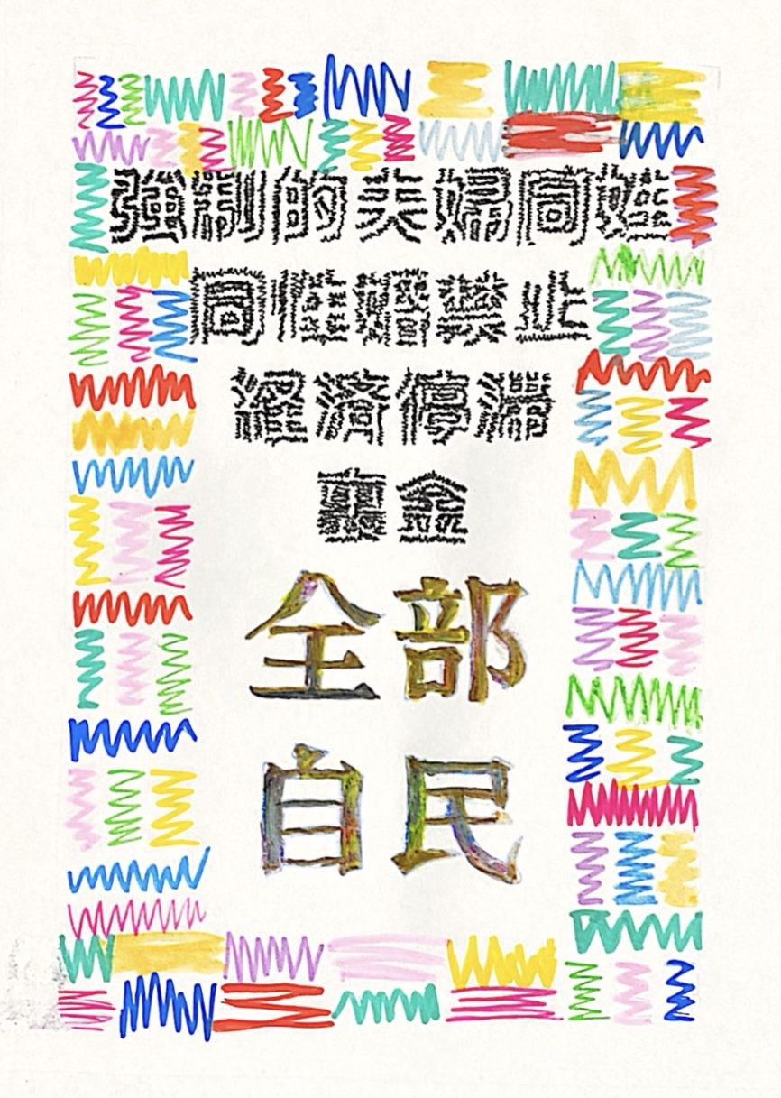 強制的夫婦同姓、同性婚禁止、経済停滞、裏金、全部自民 というメッセージがカラフルなギザギザに囲まれてる