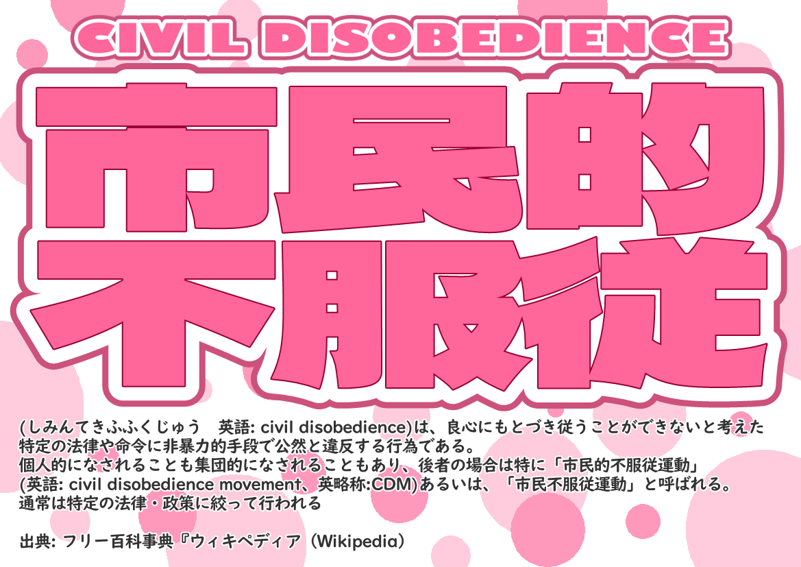 4. 画像の説明(altテキスト)ピンクの水玉背景に市民的不服従と大きく書かれている