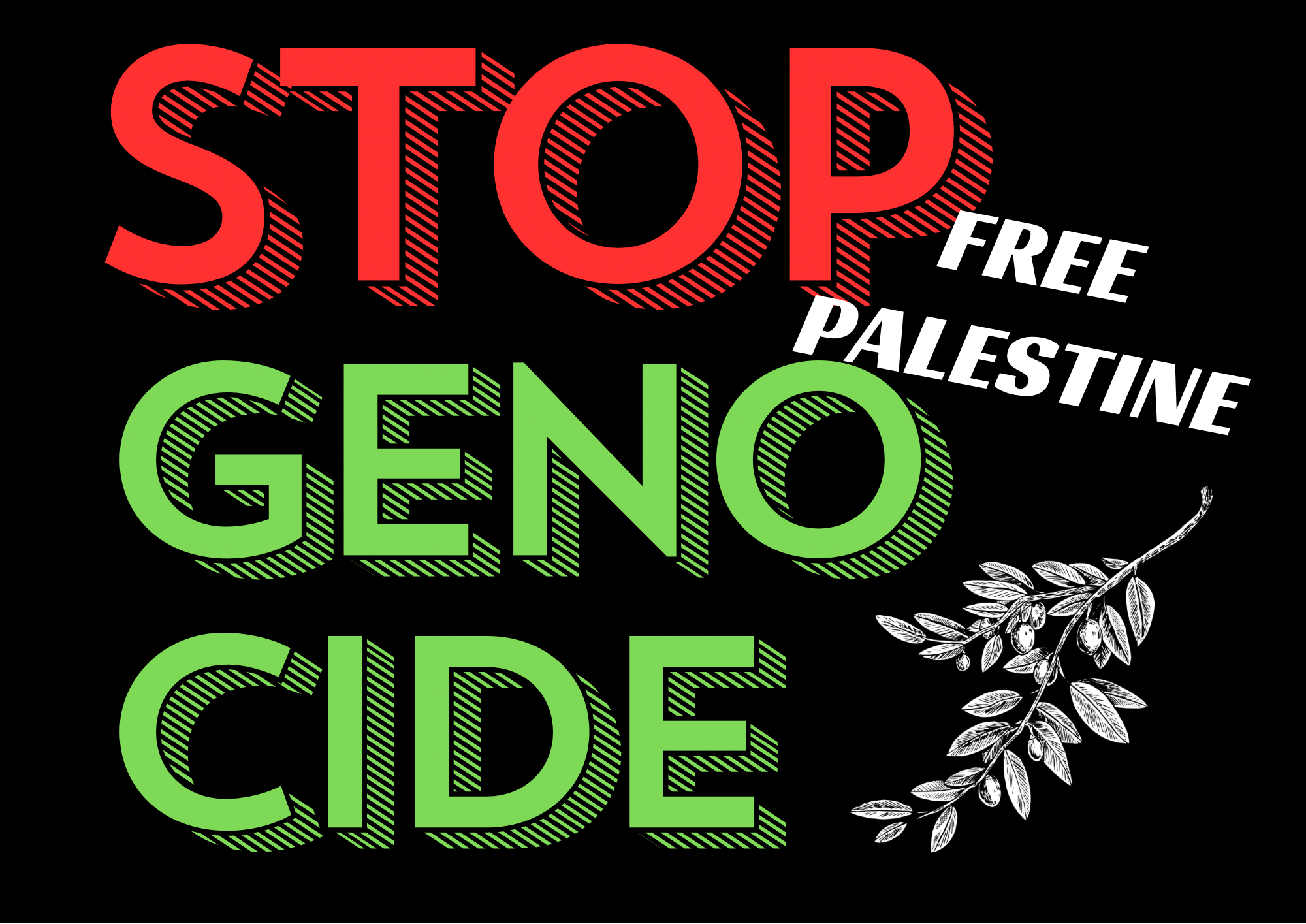 黒地の背景に赤と緑の文字で「STOP GENOCIDE」と書かれている。右上には「FREE PALESTINE」の文字とオリーブのイラスト。